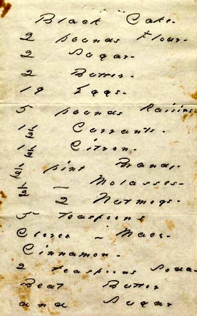 She had her work cut out for her. The recipe called for two pounds of flour, two pounds of butter, five pounds of raisins, and nineteen eggs, among other ingredients. It made a twenty pound cake. She didn’t have a cake pan that could contain any such thing. She wasn’t sure if such a thing would even fit in their oven.