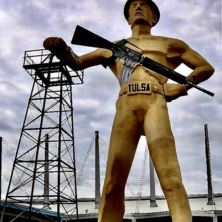 It was the Tulsa Arms Show, the biggest baddest show in the world with over 4,000 vendors inside an 11-acre air-conditioned auditorium. The carnival featured old and modern guns, flintlocks and repeaters, Glock troublemakers and Colt Peacemakers. American flags flapped all over the place. Posters for “MAGA” were everywhere. “Jesus Saves” was everywhere. It was a super-duper spectacle.